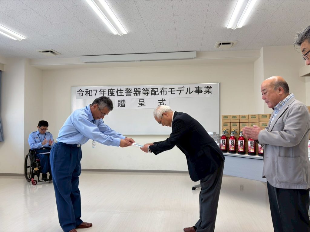 一般社団法人全国消防機器協会が実施している「住宅用火災警報器等の無償配布モデル事業」(総務省消防庁協力)に対し気仙沼市の上地区自主防災組織本部が選ばれ,9月16日に贈呈式を開催しました。