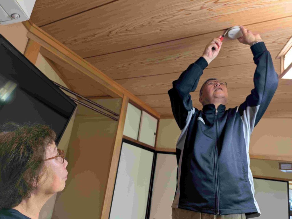 贈呈式では,気仙沼消防署の佐藤署長から上地区自主防災組織本部の小山本部長,石森副本部長,春日副本部長に対し,住宅用火災警報器100個,住宅用消火器25本,防炎毛布25枚が贈られ,早速,古町三区自治会では加藤自治会長が地区内の高齢者宅の寝室と台所に住警器を設置していただきました。